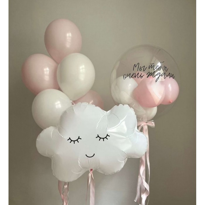 Состав композиции:Шары латексные 35 см однотонные – 7 штШар “Bubbles” 60 см с надписью и мини-шарами – 1 штШар “Облачко” 61 см – 1 шт... Читать далее...