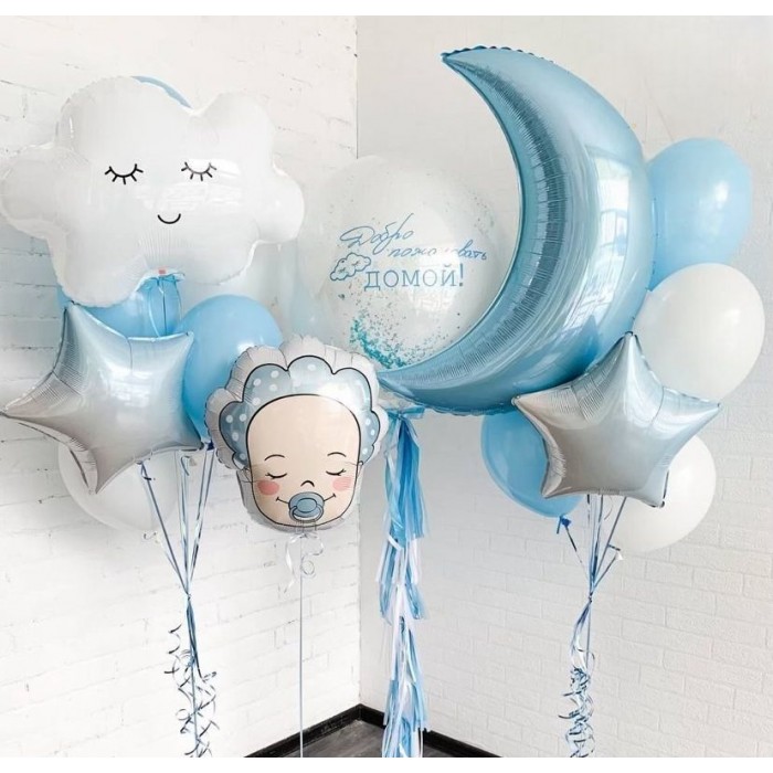 Баблс с конфетти 80 см и индивидуальная надписьФольгированная фигура "Полумесяц"Фольгированная фигура "Малыш"Фольгированная фигура "Облачко"2 звезды 48 см10 пастельных шаров... Читать далее...