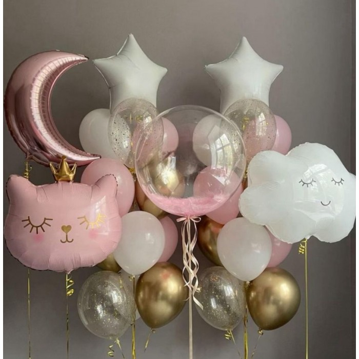 1 Бабл с перьями- 1 фигура "Принцесса - кошечка"- 1 фигура "Полумесяц"- 1 фигура "Облачко"- 2 фонтана по 13 шаров со звездами... Читать далее...