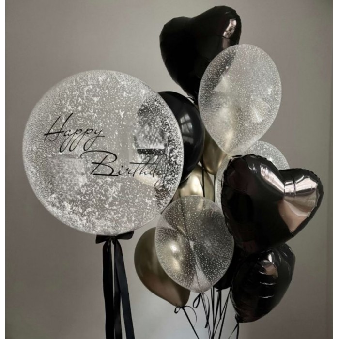 Состав композиции:Шар “Bubbles” 60 см с надписью и конфетти – 1 штСердце (фольга) однотонные – 3 штШары с конфетти – 3 штШары “Хром”- 3 шт Шары однотонные – 2 шт... Читать далее...
